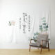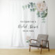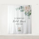 Bannière de shower de mariage élégante, classique, style moderne, tapisserie. Décoré de pivoines aquarellées blanches, fleurs et verdure d'eucalyptus. Avec le texte : Shower de mariage écrit avec un style d'écriture manuscrite moderne de couleur noire. Personnalisez et ajoutez le nom de la mariée et une date. Peut être utilisé comme bannière de bienvenue, décoration murale pour le shower de mariage ou comme toile de fond pour photos.