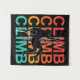 Climb, Mountain Rock Climber Brave Aventure Tapestry avec une silhouette d'un grimpeur au milieu. Une image très cool à accrocher dans votre bureau, chez vous, chambre, dortoir ou salle de sport. Les ensembles arrière - plans noirs des 4 couleurs différentes des mots grimpent et accentue le contour blanc du grimpeur.