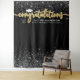 Un panneau de fond élégant pour la fête de remise de diplômes célèbre votre diplômé avec style ! Le design présente une casquette de diplômé, "Félicitations" en écriture moderne en feuille d'or faux, et un texte personnalisé moderne qui peut être personnalisé avec le nom du diplômé, l'année de promotion et l'école. Comprend une bordure de confettis argentés et blancs scintillants. La couleur de fond noir peut être modifiée.