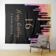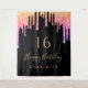 Une tapisserie tendance et glamour Sweet 16, 16ème (ou âge de bonbons) anniversaire. Un arrière - plan noir classique décoré avec des gouttes de parties scintillant irrégulière de couleur arc-en-ciel, la peinture goutte à goutte dans l'or violet, rose et rose. Avec le texte : 16 Joyeux anniversaire. Personnalisez et ajoutez un nom. Texte de couleur dorée. Peut être utilisé comme bannière de bienvenue, fond de cabine photo et décoration murale de fête.