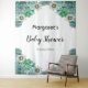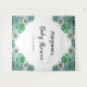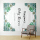 Une tapisserie élégante pour une Baby Shower. Décorée de plantes succulentes, cactus, fleurs de cactus sur un fond blanc élégant. Fleurs en argent, vert et gris. Modèles pour le nom de la future maman et la date de la douche, lettres noires et grises.