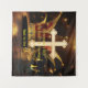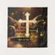 Grande croix dorée avec casquette de jester et couronne d'or avec design typographique.