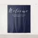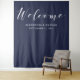 Ce superbe fond de photobooth de mariage présente une calligraphie moderne blanche ainsi que du texte assorti moderne, sur un fond bleu foncé élégant.