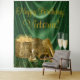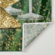 Bannière de fond de fête d'anniversaire pour femme en vert émeraude et or avec de belles chaussures à talons hauts dorés, boîte cadeau, parfum et verres à champagne sur un beau fond en satin vert émeraude. Cette belle bannière de fond de chaussure à talons hauts en vert émeraude et or est facilement personnalisable avec le texte de votre choix dans le style et la couleur de police de votre choix.