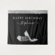Tapisserie élégante et chic de fond de photo de joyeux anniversaire moderne argent et noir avec chaussures à talons aiguilles pailletées argentées et nom en écriture cursive personnalisée en noir et blanc.