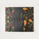 Une illustration originale de fleurs d'hibiscus jaunes et orange vif romantiques d'été, de fleurs de chrysanthème à pompons rouges avec des vignes vertes tourbillonnantes et une silhouette fantaisiste d'hirondelles sur un fond de tableau noir. Un beau design thématique floral tropical et élégant pour un mariage de jardin.