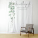 Fond de photo de mariage avec noms et date Eucalyptus pratique pour vous et vos invités de mariage pour prendre des photos mémorables avec, avec une belle branche de feuilles d'eucalyptus aquarelle coulant du haut gauche et mis en scène de manière informelle et élégante pour Le Mariage De sur fond blanc. Personnalisez facilement vos noms et date de mariage.