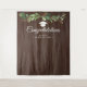 Un beau fond de photo pour ajouter quelque chose de spécial à votre fête de remise de diplôme. Ce design présente un arrangement d'eucalyptus vert à l'aquarelle sur un bois foncé peint et une casquette de remise de diplôme blanche et dorée en dessous. "Félicitations" est en police cursive blanche et votre nom et classe/date sont également en police sans empattement blanche.