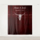 Fond de scène pour photobooth de réception de mariage rodeo cowboy pays occidental burgundy taureau vache crâne rustique western. Décoration de style ferme. Inspiré de l'ouest sauvage antique vintage pour les jeunes mariés. Conception d'animal de ferme cool. Personnalisez votre texte pour votre jour spécial. Image copyright Marg Seregelyi Photographie.