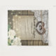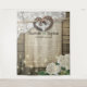 Modèles de fond de stand photo de mariage de style campagne rustique - Couple avec un vieux cœur en fer à cheval avec nœud de corde et dentelle blanche, fleur d'hydrangea, lumières de ficelle et toile de jute sur fond de bois de vieille grange.