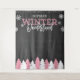 Ce fond de scène moderne pour anniversaire "hiver onederland" présente un motif de forêt enneigée sur un fond de tableau noir. Les couleurs rose et blanc ressortent vraiment sur le fond gris foncé. Tellement mignon pour une fête de premier anniversaire d'hiver.