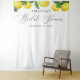 Cette tapisserie de fête prénuptiale lumineuse et joyeuse présente des citrons aquarelles et des lettrages en écriture douce, créant un arrière-plan chaleureux et accueillant pour les photos et la décoration de fête. Le design comprend une œuvre d'art aux agrumes peinte à la main le long du haut et une calligraphie élégante pour le texte principal. Vous pouvez facilement personnaliser le nom et la date pour correspondre à votre événement. Cette tapisserie fonctionne à merveille comme arrière-plan photo, fond de table de dessert, décoration murale ou présentoir d'entrée pour toute fête prénuptiale sur le thème des citrons ou des agrumes. Elle ajoute une touche fraîche et ensoleillée à votre célébration et est simple à personnaliser en ligne.