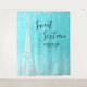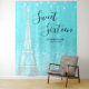 Un tapis de fond chic sarcelle sur le thème de Paris pour une douce 16. Le design présente une illustration de la tour Eiffel, des guirlandes lumineuses et une police de caractères calligraphique moderne.
