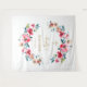 Ce modèle élégant de couronne florale pour un baptême, recommandé pour une fille, est constitué d'un cercle de fleurs avec des feuilles vertes et des roses rouges, avec une croix dorée à son sommet. Le nom de l'enfant est écrit dans un élégant style calligraphique ; le reste est écrit en majuscules.