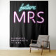 Tapisserie de photobooth noire personnalisée "future Mrs" moderne et élégante pour votre enterrement de vie de jeune fille, avec "future" et "MRS" écrits en écriture sarcelle bleue et rose chaud avec un effet néon. Vous pouvez personnaliser avec votre nom et la date de la fête. Le coin inférieur est laissé vide pour une zone pour que vos invités prennent des photos.