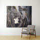 Le chaton tuxedo noir et blanc est assis à côté d'une gargouille. Derrière eux se trouve un château et des dragons.