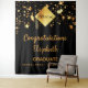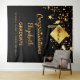 Un arrière - plan noir chic. Décoré d'étoiles dorées dégoulinantes et d'un casquette en faux or abstrait, casquette, haut de gamme avec l'année à l'intérieur. Personnalisez et ajoutez un nom, un nom d'école/année. Le texte : Félicitations et le nom sont écrits avec un grand script de style à la main moderne. Pour lui et elle. Une bannière, décoration de fête, ou stand photo, fond de scène, Année (n'importe quelle année) fête de remise de diplômes.