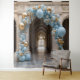 Joli arc de ballon bleu pastel et or avec bâtiment majestueux, tapisserie suspendue, cadre élégant de photos d'anniversaire d'argent ou d'or, photos Mariages ou tout événement ou occasion