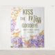Un boho chic, simple, moderne, élégant, formel et classe douche nuptiale fond avec un titre "Kiss the Miss Goodbye", avec un jardin arrière - plan d'hydrangées violettes luxuriantes et de papillons dorés (c'est un effet numérique, pas de l'or réel) et de calligraphie moderne. Un design chic et intemporel qui allie un design mariage traditionnel et formel à une calligraphie de script moderne et à une mise en page tendance.