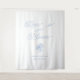 Blue Hydrangea Bridal Shower Tapestry featuring the romantic phrase “Love Is in Bloom” in elegant script, a stunning backdrop for photos and dessert tables.