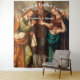 La tapisserie Mariage catholique vintage présente une reproduction du célèbre tableau "Le mariage de la Vierge" de Pedro Ramírez, peint en 1688 comme design central. Votre message est affiché ci-dessus sous forme d'arc, les noms de la mariée et du marié apparaissent juste en dessous de l'arc. Tout le texte est personnalisable. Conçu pour accueillir la suite mariage "catholique Vintage".