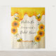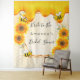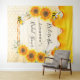 Tapisserie amusante de douche de mariée d'été. Fond jaune et blanc avec un motif de nid d'abeille. Avec un cadre géométrique en faux or. Décoré de tournesols aquarellés rustiques jaune clair et orange, de joyeuses abeilles et de miel doré sucré qui coule. Avec le texte : Future mariée. Personnalisez et ajoutez le nom de la future mariée. Peut être utilisé comme décoration murale pour la douche de la mariée ou comme toile de fond pour les photos.
