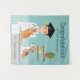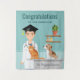 Félicitez un étudiant vétérinaire pour son diplôme avec l'aide de cette conception personnalisée qui présente l'illustration originale de Destei, mignonne, d'une femme vétérinaire dans une salle d'examen d'une clinique vétérinaire. Le vétérinaire porte une casquette noire avec un moule jaune, un manteau de laboratoire blanc, des gommages bleus et il a un stéthoscope autour du cou. Le vétérinaire a des cheveux bruns et une expression du visage souriant. Sur le mur, deux étagères marron flottant avec un plante vert et deux petites jarres de médecine sont placées dessus. Devant le vétérinaire, il y a un chat orange et un chiot de couleur brune et blanche assis sur une table d'examen grise. Il y a aussi des zones de texte personnalisables idéales pour écrire un message personnalisé avec le nom du diplômé.