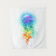 Grande méduse irisée, artistiquement dessinée, brillante, avec de longues tentacules sur le blanc, peinte sur l'arrière - plan multicolore. Méduse arc-en-ciel.