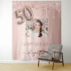 Une tapisserie pour une fête d'anniversaire de 50 ans girly et glamour. Un fond dégradé rose et or rose avec des gouttes de fausse brillance couleur or rose élégantes, aspect de peinture qui coule. Personnalisez et ajoutez votre propre photo de haute qualité de la fêtée. Le texte : le nom est écrit en or rose foncé avec un style de lettrage manuscrit moderne avec des fioritures. Le numéro 50 est écrit avec une police de caractères à l'aspect ballon tendance. Pour conserver les fioritures, supprimez simplement le nom d'exemple, laissez les espaces ou les émojis devant et après le nom. Peut être utilisé comme bannière de bienvenue, décoration murale pour la fête ou comme toile de fond pour photomaton.
