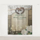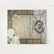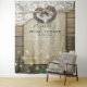 Toile de Fond pour Photobooth de Mariage / Fête de Mariage de Style Campagnard Rustique - Couple Fer à Cheval Ancien avec Nœud de Corde et Dentelle Blanche, Fleur d'Hydrangea, Guirlande Lumineuse et Toile de Jute sur Fond de Bois de Grange Ancien.