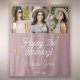 Joyeux anniversaire ! Photo Booth personnalisé ou mur de fête en arrière-plan comme décor de mur de fête d'anniversaire! Espace pour 3 photos de la fille d'anniversaire, et facilement customiser le design de typographie moderne avec votre nom, message, et date de naissance. Cette disposition présente des confettis en or imprimé qui scintillent sur un arrière - plan rose vif.