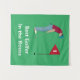 Golfeur, portant un casquette, chemise rouge profonde et pantalon bleu, mettant une balle de golf dans un design de pierre de trou. Ajoutez votre propre texte.