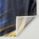 Ce motif présente une fusion époustouflante de bleu royal et d'or, magistralement entrelacé pour former un motif tourbillon abstrait qui captive l'oeil. Cette composition dynamique dégage une qualité organique, qui rappelle les paysages naturels, où les lignes et les courbes fluides suggèrent les douces ondulations des collines et des vallées. L'interaction des couleurs est encore renforcée par l'inclusion de belles tonalités métalliques irisées qui brillent et se déplacent avec la lumière, créant une expérience visuelle fascinante. Cette image est générée par l'IA.
