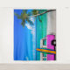 Cette conception de scène de plage tropicale présente une camionnette rose fuchsia vif et une planche de surf colorée près de palmiers et sur une plage de sable blanc avec de l'eau de mer bleue turquoise. C'est le design parfait pour un fond de photomaton de fête, ou pour le surfeur, pour la chambre d'un étudiant, pour une chambre, un bureau, ou tout espace où vous voulez apporter les tropiques. Conception et photographies de la plage et des palmiers par T.K. Goforth et signées par l'artiste, tous droits réservés.