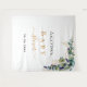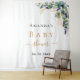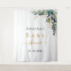 Un fond blanc élégant. Décoré avec des feuilles d'eucalyptus aquarelles vertes, des brindilles, de la verdure et des feuilles en or faux. Personnalisez et ajoutez le nom de la maman à venir et une date. Lettres noires et dorées. Peut être utilisé comme bannière de bienvenue pour une fête prénatale, comme décoration de salle ou comme toile de fond pour un photomaton.