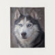 Cette peinture numérique représente un Husky sibérien debout sur la neige, sa fourrure brillant de reflets glacés tandis que le paysage hivernal s'étend sans fin derrière lui. Les yeux expressifs du chien attirent l’attention du spectateur.