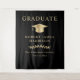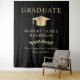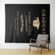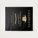 Élégante soirée noire bienvenue tapisserie et stand photo en arrière-plan avec un casquette d'or, "Graduate" et le nom du diplômé, l'école et année de classe en typographie or classique.