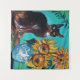 ) Expressive, chatte noir capricieux, tournesols colorés et feuilles verts dans les couleurs jaune et bleu turquoise. Peinture acrylique originale artistique et vibrante sur panneau en bois par Bulgan Lumini (c)