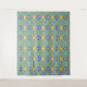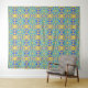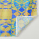 Un motif géométrique complexe est formé par des rubans entrelacés de teintes bleues et jaunes, créant un effet kaléidoscopique et harmonieux. Les formes répétées dessinent l'oeil à travers une grille symétrique, évoquant un sens de l'équilibre et du rythme.