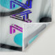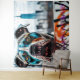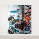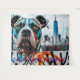 L'image montre un grand chien aux yeux frappants et aux marques colorées sur le visage, ressemblant à une peinture artistique du visage ou à un masque. Le chien surplombe un balcon avec des graffitis, dressé contre un paysage urbain flou avec de hauts immeubles, créant un contraste frappant entre les éléments naturels et urbains.