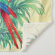 Tapestry in vividly colored tropical birds surrounded by lush green foliage and vibrant flowers. The birds display brilliant shades of red, blue, yellow, and green. The scene depicts exotic beauty and rich botanical detail.