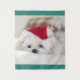 Tapisserie avec une adorable photo d'un mignon chien blanc portant un casquette de Noël rouge.