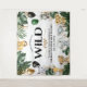Le design présente une végétation de palmiers jungle et des feuilles de bananes ornés d'imprimés dorés, de ballons noirs et verts. Les modèles de ballets comportent également des confettis imprimés en faux or. Le modèle est également décoré de petites girafes, de rhinocéros, d'éléphants, de lions, de zèbres, d'hippopotames et d'aquarelles paresseuses pour un thème safari. Wild one est imprimé dans des polices modernes et tendance.