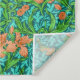 Tapisserie dans un William Morris, Art Nouveau, impression textile d'iris et de feuilles, numériquement rehaussée et colorée, en mandarine orange, vert citron et douce aqua, sur un profond arrière - plan turquoise / turquoise