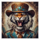A whimsical Tiger named Terence wearing a hat, tie and roaring.