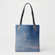 The original photograph by ZoeSPEAK on this Tote Bag captures a flock of terns taking off from the beach, heading out over the ocean. The white birds, in the light of the late afternoon sun, stand out against the deep blue sky. The terns have black feathers on their heads and wing edges, and forked tails like swallows’ tails.