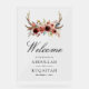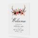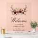 Elegant wedding welcome sign featuring rustic flowers bouquet and stag antlers.