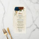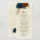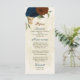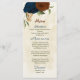 Beautiful earth tone fall wedding menu card featuring terracotta, beige and navy blue flowers with green leaves .