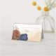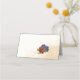 Beautiful earth tone fall wedding place card featuring terracotta and navy blue flowers with green leaves . The gold glitter details are simulated.