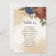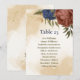 Beautiful earth tone fall seating chart card featuring terracotta and navy blue flowers with green leaves. The gold glitter details are simulated.
